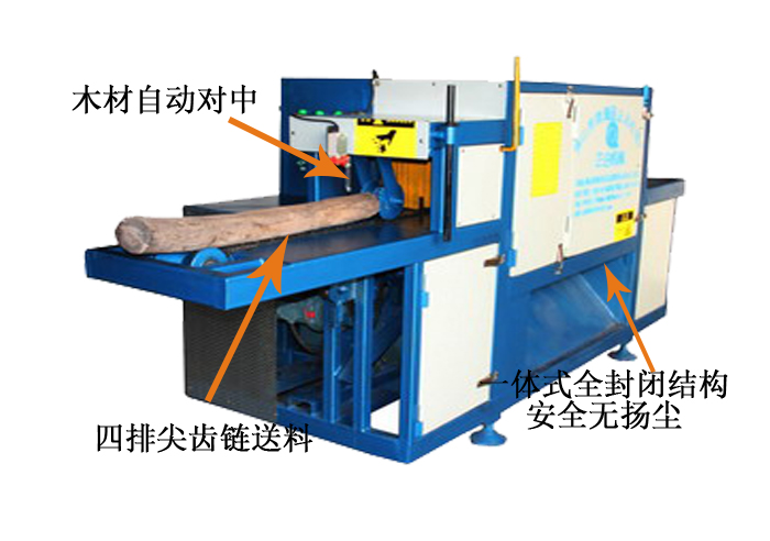 送 料:采用四排尖齒鏈條輸送,機上配有變頻智能調速器,可以對大小木料的進料速度實行自由調速。原木可以實現自動分中,機上還配有限位開關,防止超去規格木料進入,防止卡木避免對機器造成損壞。