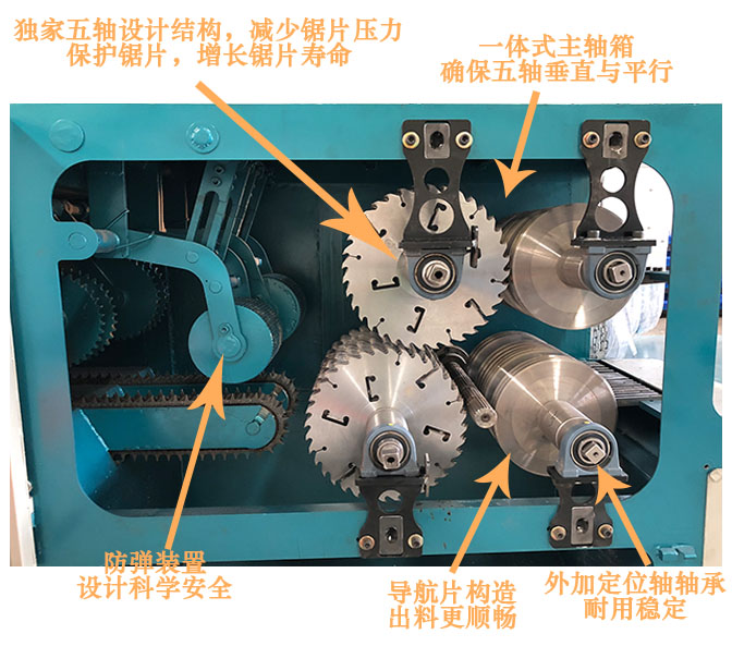 ZQ250型雙排鏈原木多片鋸是針對原木鋸切而設計的專用機床,采用五軸結構設計-前鋸后導航確保木板的精確度,無論木板長短均可保證鋸切木材尺寸公差在0.2mm-0.5mm之內,尺寸標準偏差小,節約木料,上下鋸軸,鋸片采用進口帶刮刀鋸片,鋸切表面光滑,無需再刨,保證不燒鋸片。采用自動分中裝置,提高木材的利用率;上壓輥主動增加壓力,送料平穩;軸心噴水冷卻鋸片,去脂降溫,增強鋸片的使用壽命。一次多片,大大提高工效;