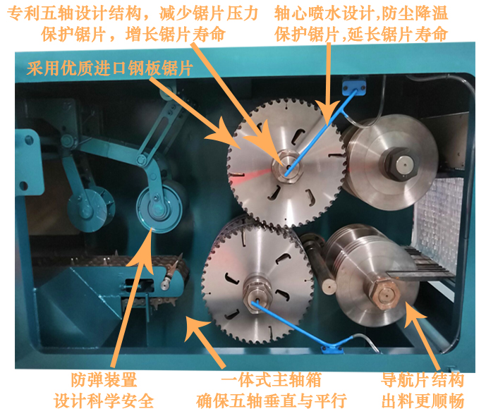 新廠地址:佛山市南海區獅山鎮羅穆路塘頭新工業園15號(塘頭牌坊對面)ZQ350型原木多片鋸是針對原木鋸切而設計的專用機床,采用五軸結構設計-前鋸后導航確保木板的精確度,無論木板長短均可保證鋸切木材尺寸公差在0.2mm-0.5mm之內,尺寸標準偏差小,節約木料,上下鋸軸,鋸片采用進口帶刮刀鋸片,鋸切表面光滑,無需再刨,保證不燒鋸片。采用自動分中裝置,提高木材的利用率;上壓輥主動增加壓力,送料平穩;軸心噴水冷卻鋸片,去脂降溫,增強鋸片的使用壽命。一次多片,大大提高工效;