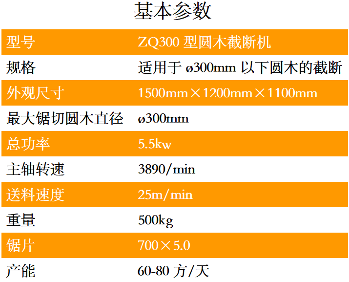 ZQ300型原木截斷機是一種截斷原木的專用機器,可取代傳統的斷木機器,只需一個人便可輕松操作,具有穩定性高,截斷面光滑平整,安全度高,生產效率高等優點。截斷長度和速度可以根據客戶實際情況調整。鋸片采用高速鋼的合金鋸片。